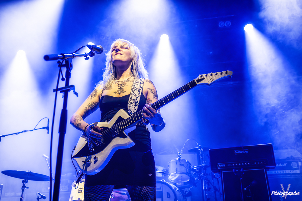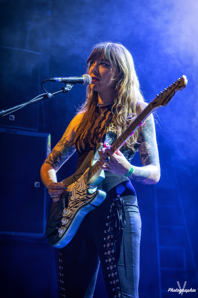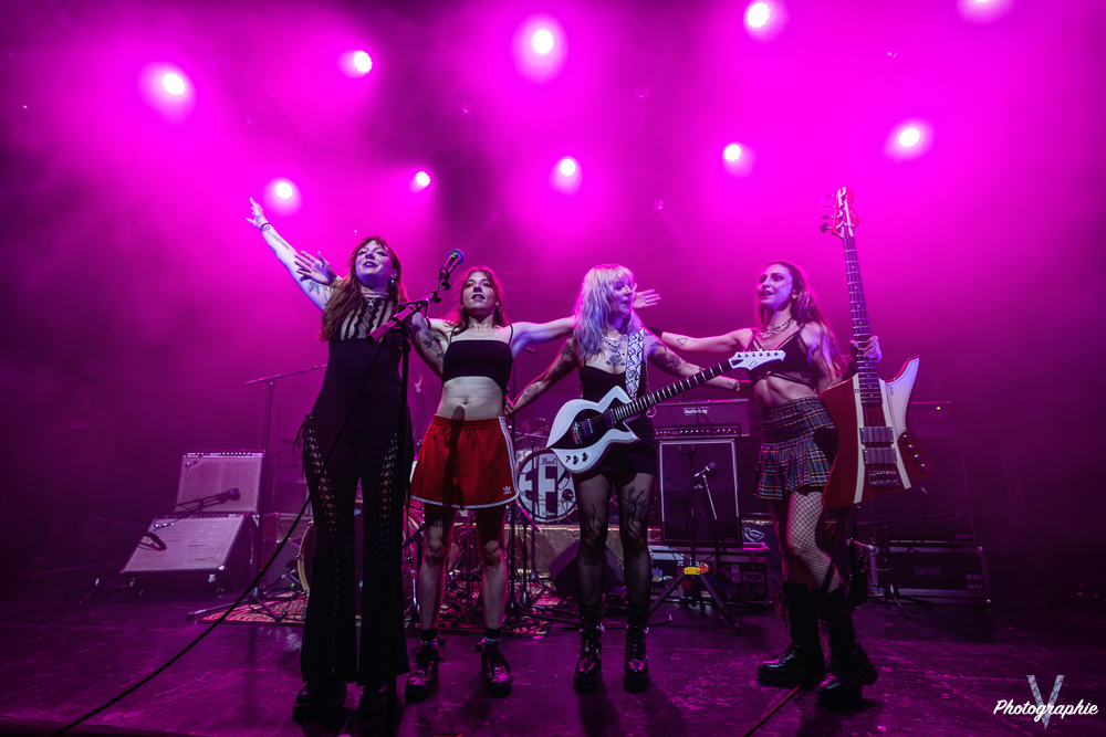 Signe que les temps changent : dans les années 90, nous aurions eu droit à une scène 100 % testostéronée. Mais ce soir, c’est un groupe exclusivement féminin répondant au doux nom de Pussy Miel qui vient chauffer l’ambiance. La salle attend avec curiosité les premières notes de leur punk. Les quatre filles débarquent en mode détente et entament leur set dans la plus grande tradition punk des seventies. Au centre de la scène, la chanteuse s’active à la guitare derrière son micro, épaulée par une seconde guitariste aux chœurs. Car ici, tout le monde donne de la voix, même derrière la batterie. À la basse, celle qui semble être la cadette de la bande affiche l’attitude la plus radicale : fuck fingers et tirages de langue de rigueur, avant de finir le set par un slam dans la fosse, portée par quelques braves