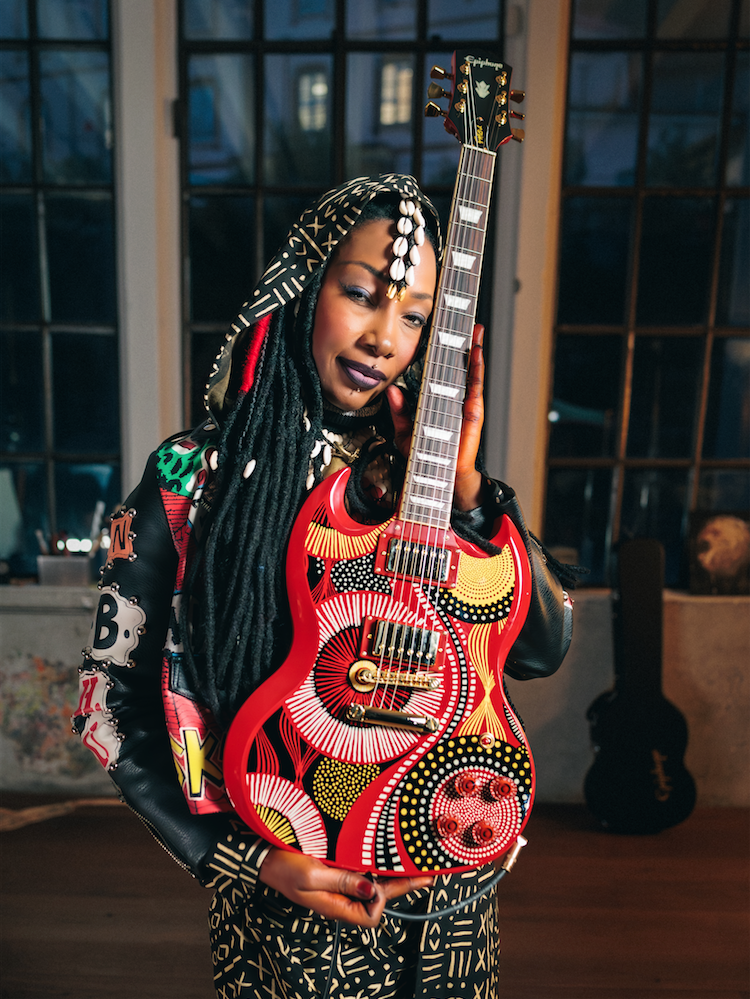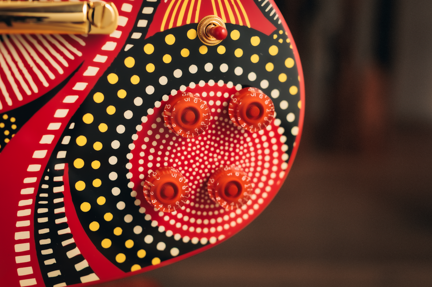 Chaque micro dispose d’un volume indépendant avec push-pull pour le split, tandis que la tonalité offre un contrôle précis ainsi qu’un push-pull d’inversion de phase permettant des sonorités hors phase (façon Peter Green). Cette conception offre à la Fatoumata Diawara SG™ une large palette sonore alliant punch vintage et timbre cristallin et en fait un redoutable outil, aussi bien pour le live que pour le studio. L’instrument se distingue également par ses finitions raffinées : artwork audacieux et multicolore inspiré des racines maliennes de l’artiste, contours de micros rouges, boutons Speed-Knobs assortis et cache-trussrod portant la signature de Fatoumata en couleur or. Totalement inspirante, cette SG incarne la rencontre entre le savoir-faire d’Epiphone et l’identité afrofuturiste de Fatoumata.
