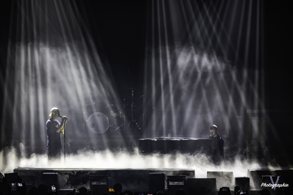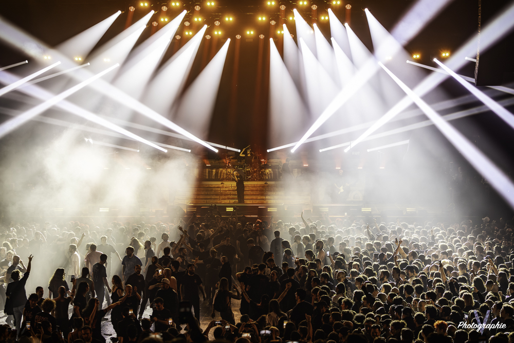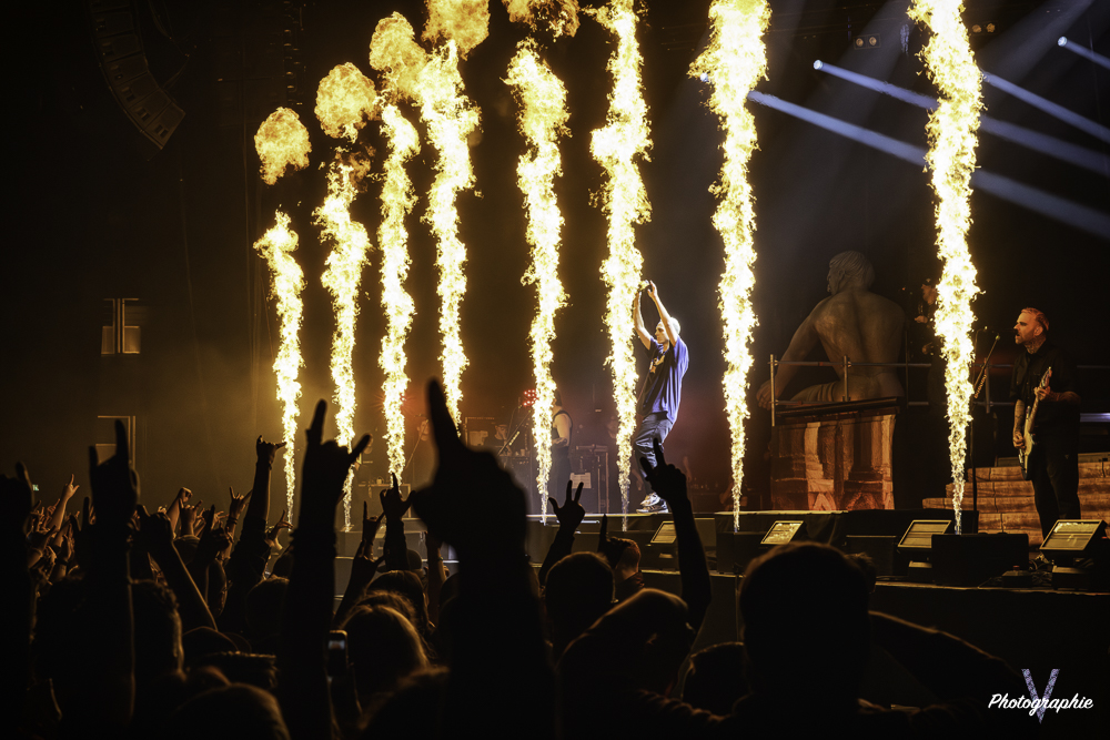 Le concert débute derrière un voile blanc, silhouettes en ombres chinoises. Puis, dès la première déflagration sonore, le rideau tombe. Deux statues monumentales encadrent la scène, un écran géant domine l’ensemble. L’esthétique est sobre, presque austère. Mais la température grimpe instantanément. Les flammes surgissent dès les premiers riffs. La pyro accompagne chaque moment clé du set. Budget carburant validé !