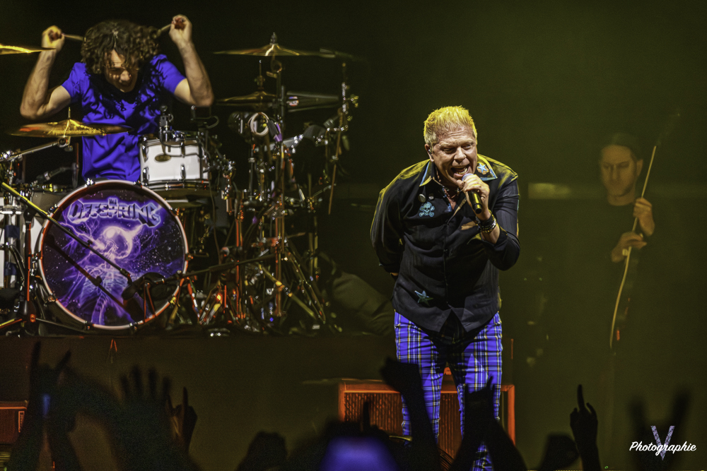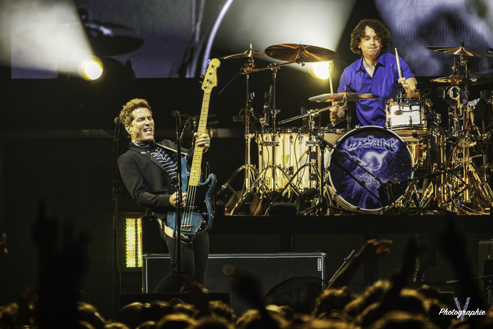 Le groupe a l’air en forme, la voix de Dexter n’est pas trop à la ramasse (il a connu des moments plus difficiles), ça accroche encore lorsqu’il flirte avec ses limites, mais ça reste à la marge. Kevin Wasserman aka Noodles, l’autre membre fondateur et emblématique guitariste du groupe, célèbre pour son air blasé et sa coupe en pétard, fait le job avec classe et décontraction. Il s’offrira même un petit solo de temps en temps, histoire de montrer qu’il n’est pas qu’un rageux du barré. The Offspring est reconnu pour user ses batteurs vitesse grand V. Le petit nouveau, Brandon Pertzborn, infuse un peu de sa jeunesse dans l’ADN de la formation et propulse le beat des chansons comme s’il avait toujours tenu la baraque. Reste maintenant à savoir pour combien de temps… A la quatre cordes, on retrouve Todd Morse, qui a intégré l’équipe en 2019 et, last but not least, le très discret Jonah Nimoy (le petit fils de Monsieur Spock, et ce n’est pas une blague), qui est un peu l’homme à tout faire, gérant les claviers, les parties de guitares additionnelles (et sur ce point, il surpasse clairement le savoir-faire des deux autres), les percussions et les chœurs. Il occupe une place en retrait à côté du batteur, mais se révèle crucial. Le groupe communique beaucoup entre les titres, mais jamais trop longuement, juste histoire de reprendre son souffle (aussi bien pour les musiciens que pour le public). Les fans ne ménagent pas leur peine et sautant non-stop. Certains iront même s’aventurer au stage diving.